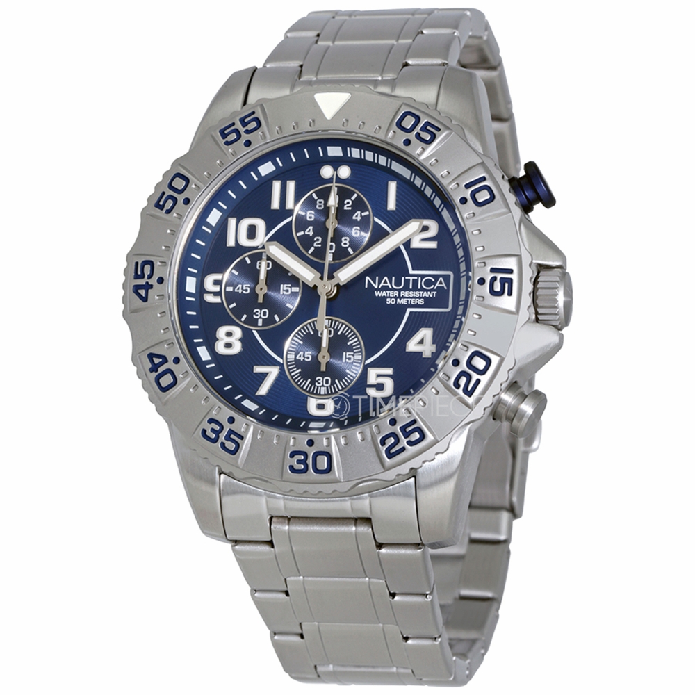 Stainless steel case with a stainless steel bracelet. Uni-directional rotating stainless steel bezel. Navy dial with luminous silver-tone hands and Arabic numeral hour markers. Minute markers around the outer rim. Dial Type: Analog. Luminescent hands and markers. Chronograph - three sub-dials displaying: 60 second, 60 minute and 1/10th of a second. Quartz movement. Scratch resistant mineral crystal. Screw down crown. Solid case back. Case size: 46 mm. Case thickness: 14 mm. Round case shape. Band width: 22 mm. Fold over clasp with a push button release. Water resistant at 100 meters / 330 feet. Functions: chronograph, hour, minute, second. Sport watch style. Nautica Chronograph Navy Dial Mens Watch NAD16003G.