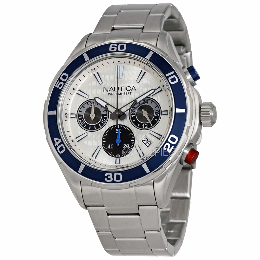 Stainless steel case with a stainless steel bracelet. Uni-directional rotating stainless steel bezel with a blue top ring. Silver dial with luminous black hands and index hour markers. Minute markers around the outer rim. Dial Type: Analog. Luminescent hands and markers. Date display between the 4 and 5 o'clock positions. Chronograph - three black sub-dials displaying: 60 second, 30 minute and 24 hours. Quartz movement. Scratch resistant mineral crystal. Screw down crown. Solid case back. Case size: 47 mm. Case thickness: 12 mm. Round case shape. Band width: 20 mm. Deployment clasp with a push button release. Water resistant at 100 meters / 330 feet. Functions: chronograph, date, hour, minute, second. Additional Info: comes with an additional white silicome strap. Sport watch style. Nautica Chronograph Silver Dial Mens Watch NAD20514G.