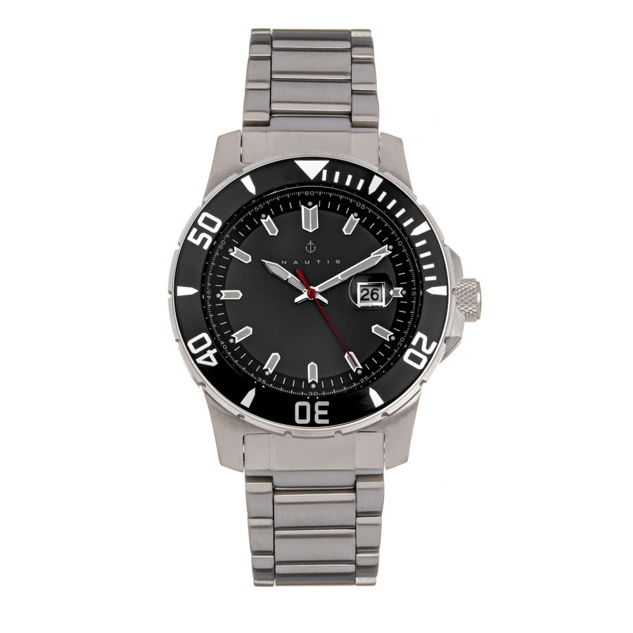 Band Color: Silver Stainless Steel; Band Width: 22mm near case; 20mm near clasp/buckle; Bezel Color: Black; Case: Silver + Circle-Shaped; Case Finish: Brushed + Stainless Steel; Case Thickness: 14mm; Case Width: 45mm; 50mm with Crown; Clasp / Buckle: Fold Over Push Button Deployment; Dial: Black + Analog; Hand Color: Silver; Movement: Japanese + Quartz; Time Zones: Single; Water Resistance: 20 ATM. Silver-tone stainless steel case and bracelet. Uni-directional rotating black stainless steel bezel. Black dial with silver-tone hands and index hour markers. Minute markers around the outer rim. Dial Type: Analog. Luminescent hands and markers. Date display at the 3 o'clock position. Quartz movement. Scratch resistant mineral crystal. Pull / push crown. Solid case back. Round case shape, case size: 45 mm, case thickness: 14 mm. Band width: 22 mm, band length: 9.25 inches. Deployment with push button release clasp. Water resistant at 200 meters / 660 feet. Functions: date, hour, minute, second. Admiralty Pro 200 Series. Casual watch style. Watch label: Japan Movt. Nautis Admiralty Pro 200 Quartz Black Dial Mens Watch GL2008-A.