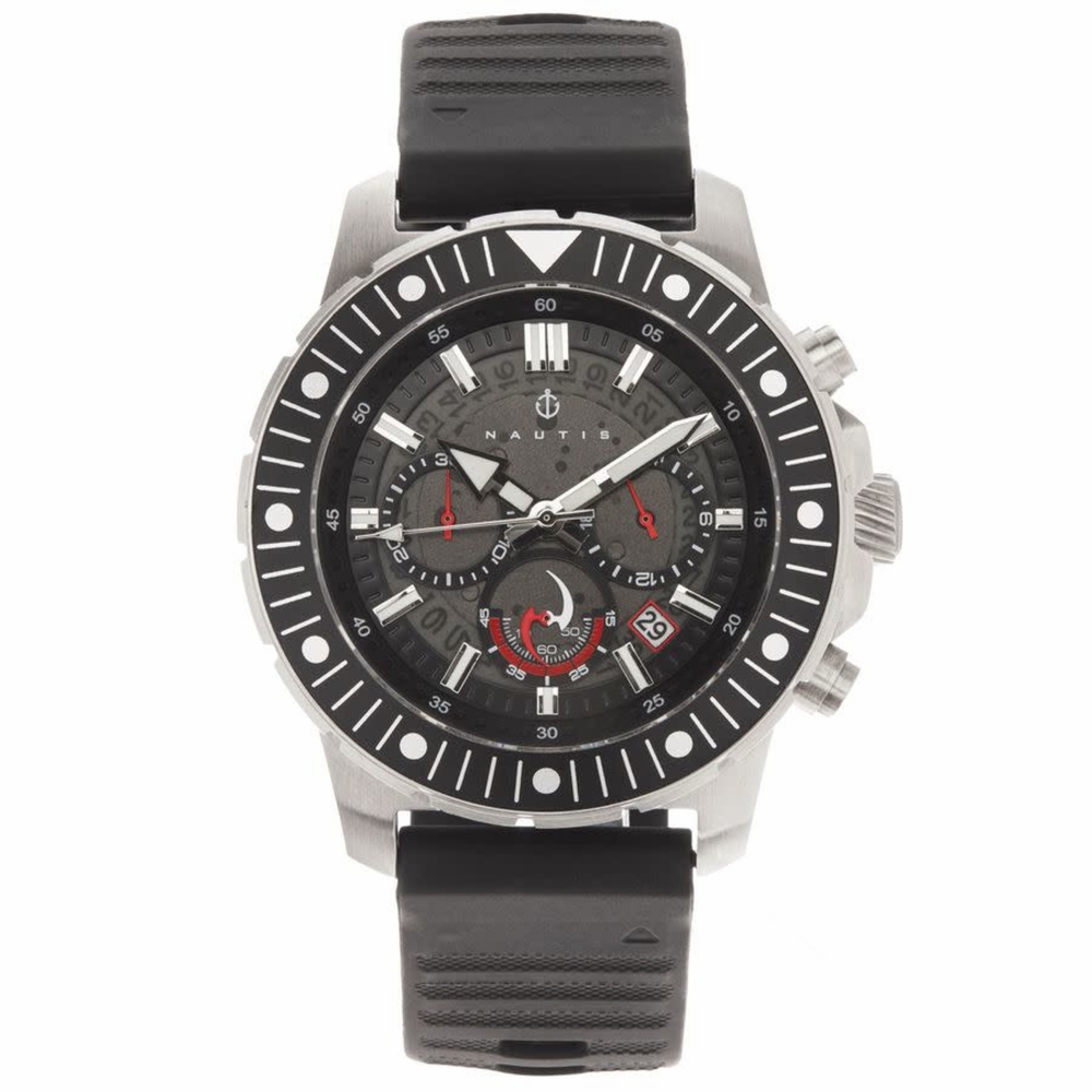 Band Color: Black Rubber; Band Width: 22mm near case; 22mm near clasp/buckle; Bezel Color: Black; Case: Silver + Circle-Shaped; Case Finish: Brushed + Stainless Steel; Case Thickness: 16mm; Case Width: 45mm; 49mm with Crown; Clasp / Buckle: Strap Buckle; Dial: Black + Analog; Hand Color: Silver; Movement: Japanese + Quartz; Time Zones: Single; Water Resistance: 20 ATM.
