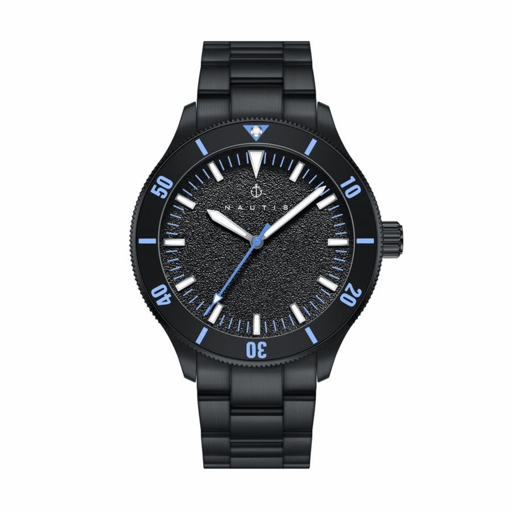 Band Color: Black Stainless Steel; Band Width: 20mm near case; 18mm near clasp/buckle; Bezel Color: Black; Case: Silver + Circle-Shaped; Case Finish: Polished + Stainless Steel; Case Thickness: 12mm; Case Width: 43mm; 47mm with Crown; Clasp / Buckle: Fold Over Push Button Deployment; Dial: Black + Analog; Hand Color: Black; Movement: Japanese + Quartz; Time Zones: Single; Water Resistance: 20 ATM.
