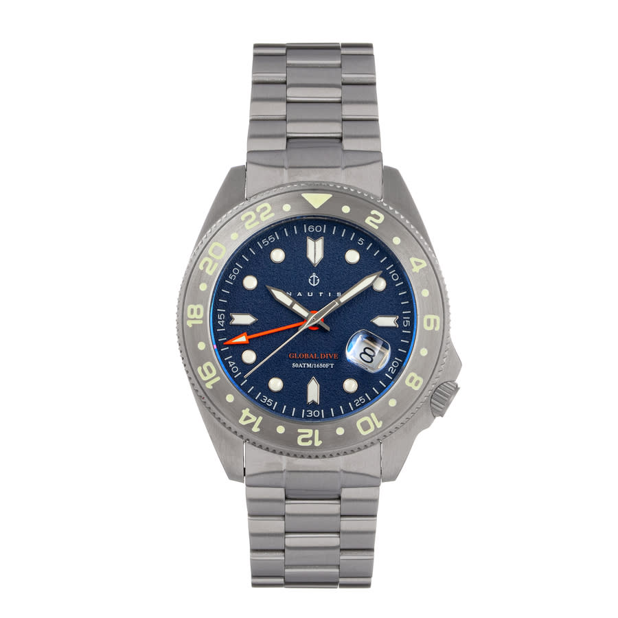 Band Color: Silver Stainless Steel; Band Width: 22mm near case; 20mm near clasp/buckle; Bezel Color: Silver; Case: Silver + Circle-Shaped; Case Finish: Brushed + Stainless Steel; Case Thickness: 15mm; Case Width: 44mm; 49mm with Crown; Clasp / Buckle: Fold Over Push Button Deployment; Dial: Navy + Analog; Hand Color: Silver; Movement: Swiss + Quartz; Time Zones: Single; Water Resistance: 50 ATM.