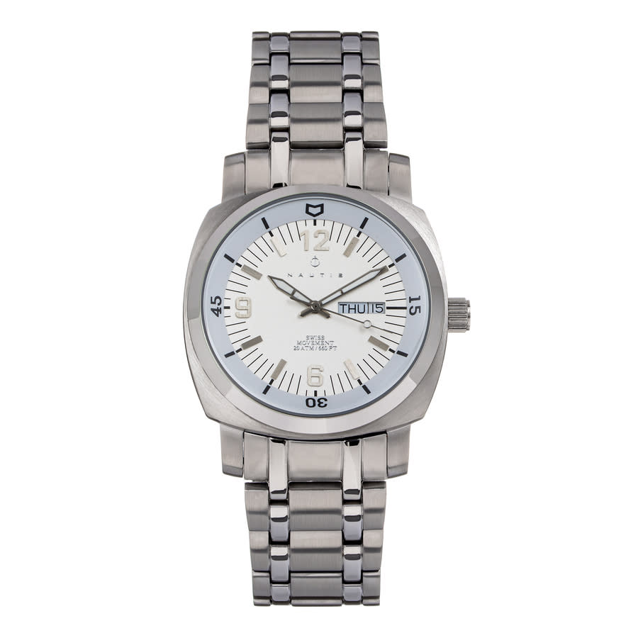 Silver-tone stainless steel case and bracelet. Fixed silver-tone stainless steel bezel. White dial with silver-tone hands and Arabic numeral & index hour markers. Minute markers around the outer rim. Dial Type: Analog. Luminescent hands and markers. Day of the week and date display at the 3 o'clock position. Quartz movement. Scratch resistant mineral crystal. Pull / push crown. Solid case back. Square case shape, case size: 45 mm, case thickness: 15 mm. Band width: 24 mm, band length: 9 inches. Deployment with push button release clasp. Water resistant at 200 meters / 660 feet. Functions: date, day, hour, minute, second. Stealth Series. Casual watch style. Nautis Stealth Quartz White Dial Mens Watch GL2087-D.