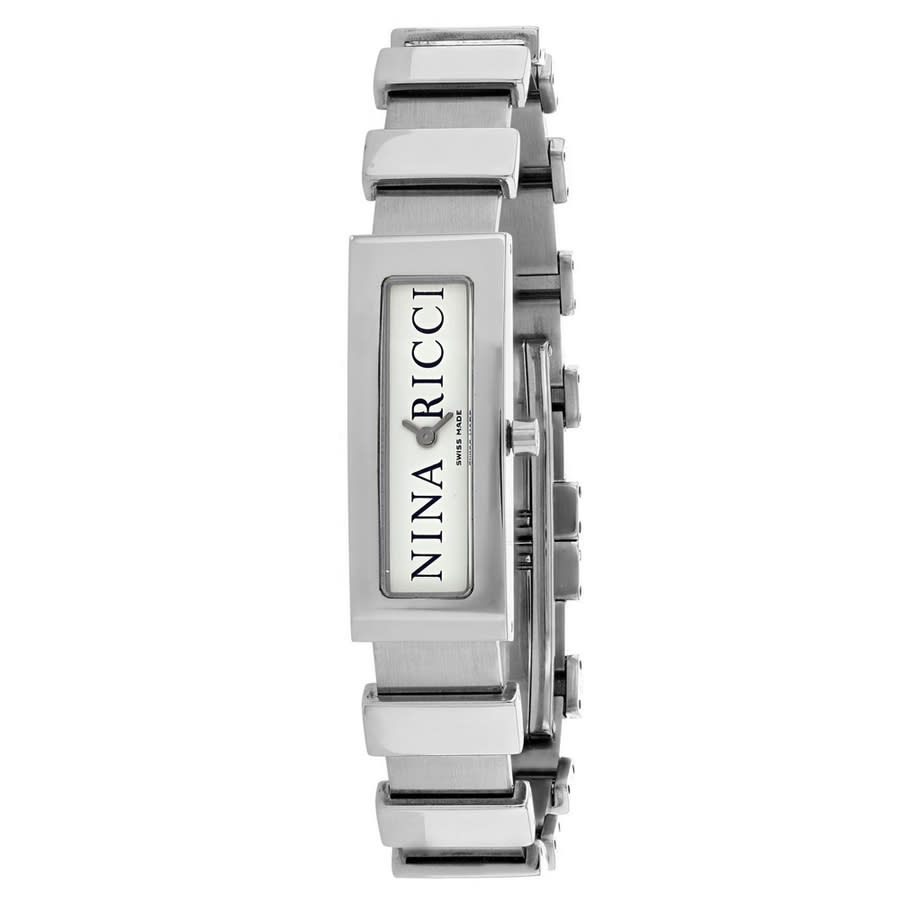 Silver-tone stainless steel case and bracelet. Fixed silver-tone stainless steel bezel. Silver-tone dial with silver-tone hands and index hour markers. Dial Type: Analog. Quartz movement. Scratch resistant sapphire crystal. Pull / push crown. Solid case back. Rectangle case shape, case size: 33 mm. Band width: 10 mm. Deployment with push button release clasp. Water resistant at 30 meters / 100 feet. Functions: hour, minute. Classic Series. Fashion watch style. Watch label: Swiss Made. Nina Ricci Classic Silver-tone Dial Ladies Watch 42200.
