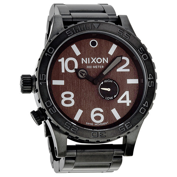 Black ion-plated stainless steel case and bracelet. Uni-directional rotating black ion-plated bezel. Dark woodgrain dial with brown hands and alternating Arabic numeral and stick hour markers. Dial Type: Analog. Tide display at the 4 o'clock position. Quartz movement. Scratch resistant mineral crystal. Solid case back. Case diameter: 52 mm. Case thickness: 15 mm. Round case shape. Fold over clasp. Water resistant at 100 meters / 330 feet. Functions: hour, minute, tide. Casual watch style. Nixon 51-30 Dark Wood Mens Watch A0571107.