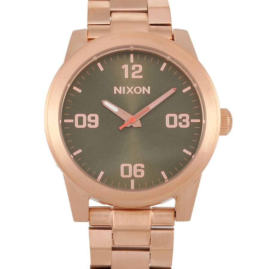 Rose gold-tone stainless steel case and bracelet. Fixed rose gold-tone stainless steel bezel. Green dial with rose gold-tone hands and Arabic numeral hour markers. Minute markers around the outer rim. Dial Type: Analog. Luminescent hands. Quartz movement. Solid case back. Round case shape, case size: 38 mm. Fold over clasp. Water resistant at 100 meters / 330 feet. Functions: hour, minute, second. G.i. Series. Casual watch style. Nixon G.I. Quartz Green Dial Ladies Watch A919-2283-00.
