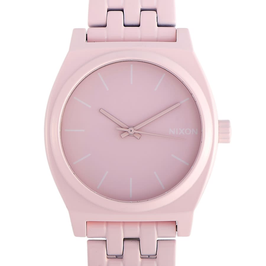 Petal pink-plated stainless steel case and bracelet. Fixed petal pink-plated bezel. Petal pink dial with petal pink hands and index hour markers. Dial Type: Analog. Quartz movement. Scratch resistant mineral crystal. Pull / push crown. Solid case back. Tonneau case shape. Case size: 37 mm. Case thickness: 9 mm. Band width: 19mm. Fold over clasp with a push button release. Water resistant at 100 meters / 330 feet. Functions: hour, minute, second. Time Teller Series. Luxury watch style. Nixon Time Teller Quartz Petal Pink Dial Ladies Watch A045-3164-00.