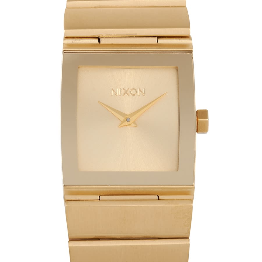 Gold-tone stainless steel case with a gold-tone stainless steel bracelet. Fixed gold-tone stainless steel bezel. Gold dial with gold-tone hands. No markers. Dial Type: Analog. Quartz movement. Scratch resistant mineral crystal. Solid case back. Square case shape. Case size: 23 mm. Folod over with push button release clasp. Water resistant at 50 meters / 165 feet. Functions: hour, minute. Lynx Series. Luxury watch style. Nixon Lynx Quartz Gold Dial Ladies Watch A1092-502-00.