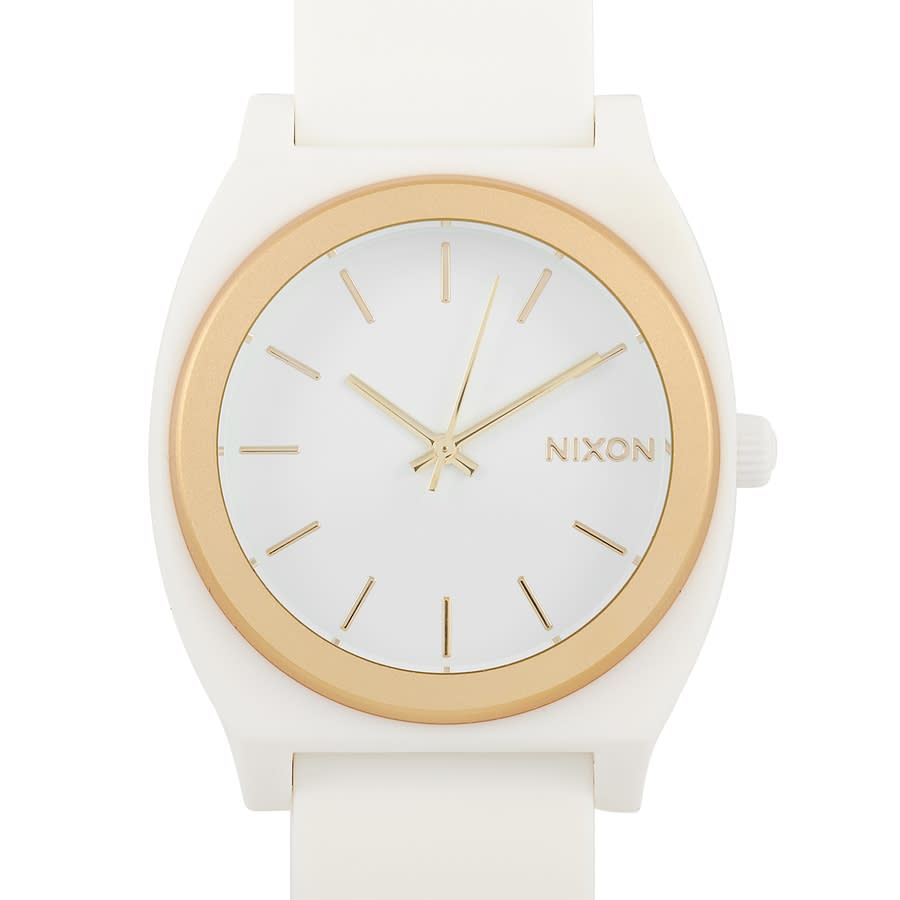 White-plated stainless steel case with a white (polyurethane) rubber strap. Fixed (anodized) gold bezel. White dial with gold-tone hands and index hour markers. Dial Type: Analog. Quartz movement. Scratch resistant mineral crystal. Pull / push crown. Solid case back. Tonneau case shape. Case size: 40 mm. Band width: 20 mm. Tang clasp. Water resistant at 100 meters / 330 feet. Functions: hour, minute, second. Time Teller P Series. Luxury watch style. Nixon Time Teller P Quartz White Dial Ladies Watch A119-1297-00.