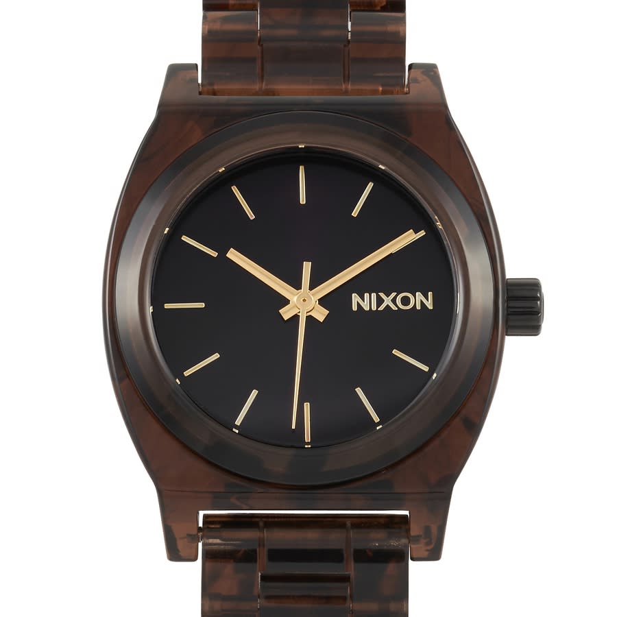 Brown acetate case with a brown acetate bracelet. Fixed brown acetate bezel. Black dial with gold-tone hands and index hour markers. Dial Type: Analog. Quartz movement. Scratch resistant mineral crystal. Pull / push crown. Solid case back. Round case shape. Case size: 31 mm. Case thickneess: 10 mm. Bracelet width: 16 mm. Fold over clasp with a push button release. Water resistant at 100 meters / 330 feet. Functions: hour, minute, second. Time Teller Acetate Series. Luxury watch style. Nixon Time Teller Acetate Quartz Black Dial Ladies Watch A1214-400-00.