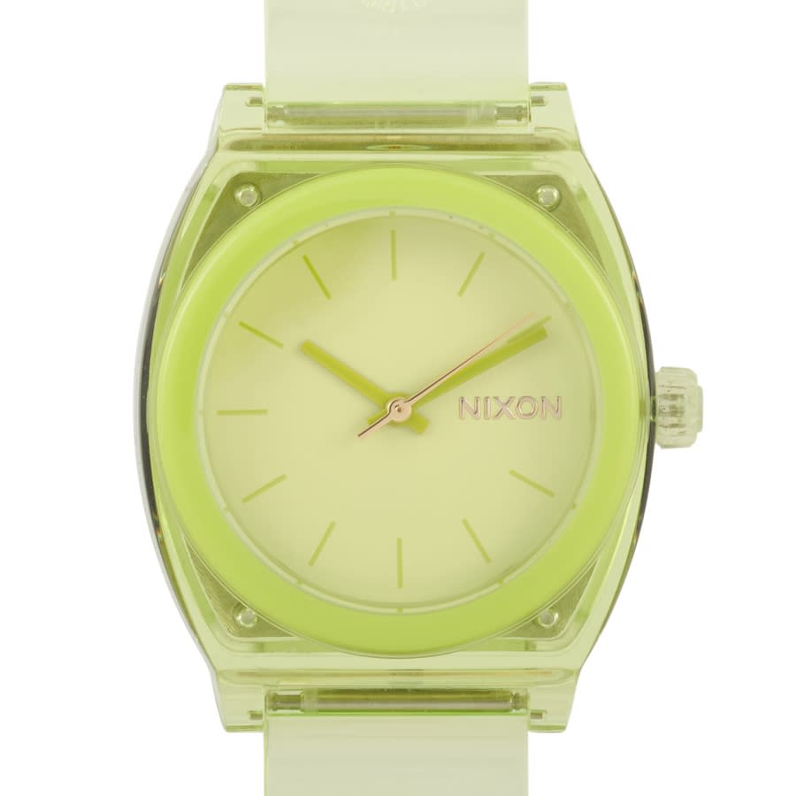 Transparent lime polycarbonate case with a lime polycarbonate band. Fixed transparent lime polycarbonate bezel. Lime dial with lime hands and index hour markers. Dial Type: Analog. Quartz movement. Scratch resistant mineral crystal. Pull / push crown. Solid case back. Tonneau case shape, Case size: 40 mm. Strap width: 16 mm. Tang clasp. Water resistant at 100 meters / 330 feet. Time Teller P Series. Luxury watch style. Nixon Time Teller P Quartz Lime Dial Ladies Watch A1215-536-00.