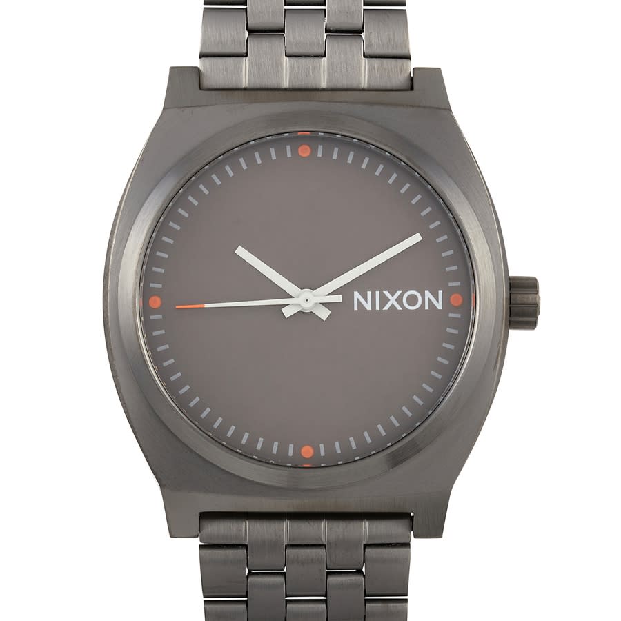 Grey-plated stainless steel case and bracelet. Fixed grey-plated bezel. Grey dial with silver-tone hands. Dot markers appear at the 3, 6, 9 and 12 o'clock positions. Minute markers around the outer rim. Dial Type: Analog. Quartz movement. Scratch resistant mineral crystal. Screw down crown. Solid case back. Tonneau case shape. Case size: 37 mm. Case thickness: 10 mm. Fold over slip through clasp. Water resistant at 100 meters / 330 feet. Functions: hour, minute, second. Time Teller Series. Luxury watch style. Nixon Time Teller Quartz Grey Dial Mens Watch A045-2947-00.