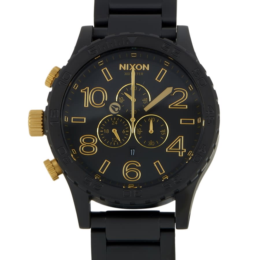 Black-plated stainless steel case and bracelet. Fixed black-plated stainless steel bezel. Black dial with gold-tone hands and Arabic numeral and index hour markers. Minute markers around the outer rim. Dial Type: Analog. Date display above the 6 o'clock position. Chronograph - three sub-dials displaying: 60 second, 60 minute and 24 hour. Quartz movement. Scratch resistant mineral crystal. Screw down crown. Solid case back. Round case shape, case size: 51 mm. Band width: 15 mm. Fold over clasp with a push button release. Water resistant at 300 meters / 1000 feet. Functions: chronograph, date, hour, minute, second. 51-30 Chrono Series. Luxury watch style. Watch label: Japan Movt. Nixon 51-30 Chrono Quartz Black Dial Mens Watch A083-1041-00.