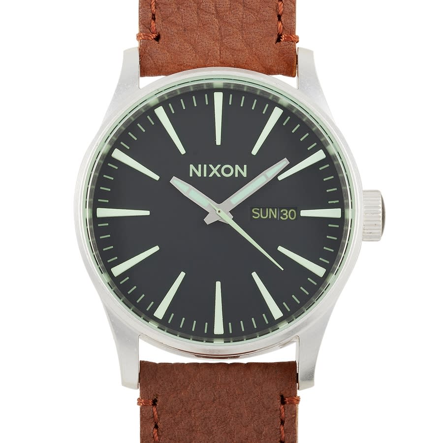 Stainless steel case with a tan leather strap. Fixed stainless steel bezel. Black dial with luminous silver-tone hands and index hour markers. Minute markers around the outer rim. Dial Type: Analog. Luminescent hands and markers. Day of the week and date display at the 3 o'clock position. Quartz movement. Scratch resistant mineral crystal. Triple gasket crown. Solid case back. Round case shape. Case size: 42 mm. Case thickness: 11 mm. Band width: 20 mm. Tang clasp. Water resistant at 100 meters / 330 feet. Functions: date, day, hour, minute, second. Nixon Series. Luxury watch style. Nixon Nixon Quartz Black Dial Mens Watch A105-1037-00.