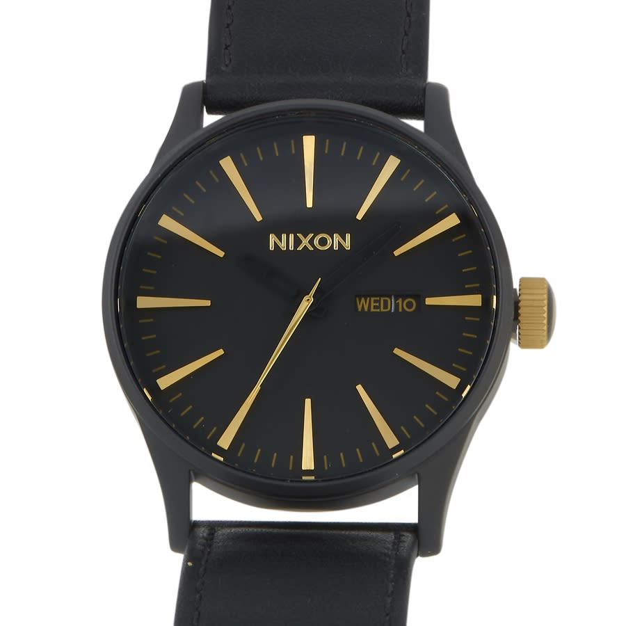 Black-plated stainless steel case with a black leather strap. Fixed black-plated bezel. Black dial with gold-tone hands and index hour markers. Minute markers around the outer rim. Dial Type: Analog. Day of the week and date display at the 3 o'clock position. Quartz movement. Scratch resistant mineral crystal. Pull / push crown. Solid case back. Round case shape. Case size: 42 mm. Case thickness: 12 mm. Band width: 23 mm. Tang clasp. Water resistant at 50 meters / 165 feet. Functions: date, day, hour, minute, second. Sentry Series. Luxury watch style. Nixon Sentry Quartz Black Dial Mens Watch A105-1041-00.