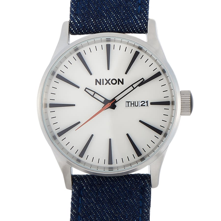 Stainless steel case with a blue demin leather backed strap. Fixed stainless steel bezel. White dial with black hands and index hour markers. Minute markers around the outer rim. Dial Type: Analog. Day of the week and date display at the 3 o'clock position. Quartz movement. Scratch resistant mineral crystal. Pull / push crown. Solid case back. Round case shape. Case size: 42 mm. Case thickness: 12 mm. Band width: 22.86 mm. Tang clasp. Water resistant at 100 meters / 330 feet. Functions: hour, minute, second. Sentry Series. Luxury watch style. Nixon Sentry Quartz White Dial Mens Watch A105-1540-00.