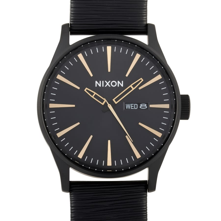 Black-plated stainless steel case with a black leather strap. Fixed black-plated bezel. Black dial with rose gold-tone skeleton hands and index hour markers. Minute markers around the outer rim. Dial Type: Analog. Day of the week and date display at the 3 o'clock position. Quartz movement. Scratch resistant mineral crystal. Pull / push crown. Solid case back. Round case shape. Case size: 42 mm. Tang clasp. Water resistant at 100 meters / 330 feet. Functions: date, day, hour, minute, second. Sentry Series. Luxury watch style. Nixon Nixon Multi-Color Dial Mens Watch A105-2987-00.