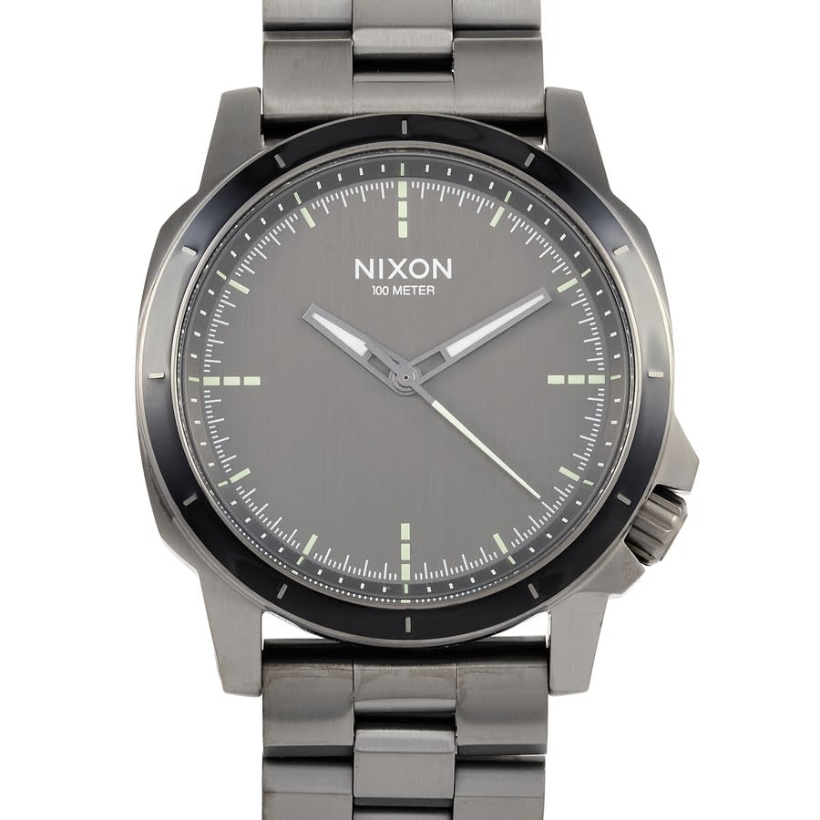 Gunmetal-plated stainless steel case and bracelet. Fixed gunmetal-plated bezel. Gunmetal dial with luminous grey hands and index hour markers. Minute markers around the outer rim. Dial Type: Analog. Quartz movement. Scratch resistant mineral crystal. Pull / push crown. Solid case back. Round case shape. Case size: 45 mm. Fold over clasp with a push button release. Water resistant at 100 meters / 330 feet. Functions: hour, minute, second. Ranger Ops Series. Luxury watch style. Nixon Ranger OPS Quartz Gunmetal Dial Mens Watch A913-632-00.