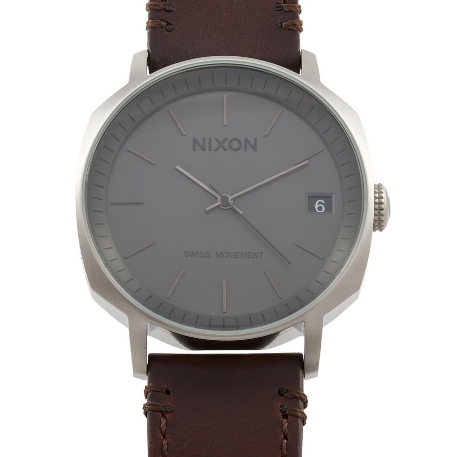 Stainless steel case with a brown leather strap. Fixed stainless steel bezel. Grey dial with silver-tone hands and index hour markers. Minute markers around the outer rim. Dial Type: Analog. Date display at the 3 o'clock position. Quartz movement. Scratch resistant mineral crystal. Pull / push crown. Solid case back. Round case shape. Case size: 43 mm. Case thickness: 11 mm. Tang clasp. Water resistant at 100 meters / 330 feet. Functions: date, hour, minute, second. Regent II Series. Luxury watch style. Nixon Regent II Quartz Grey Dial Mens Watch A973-2342-00.