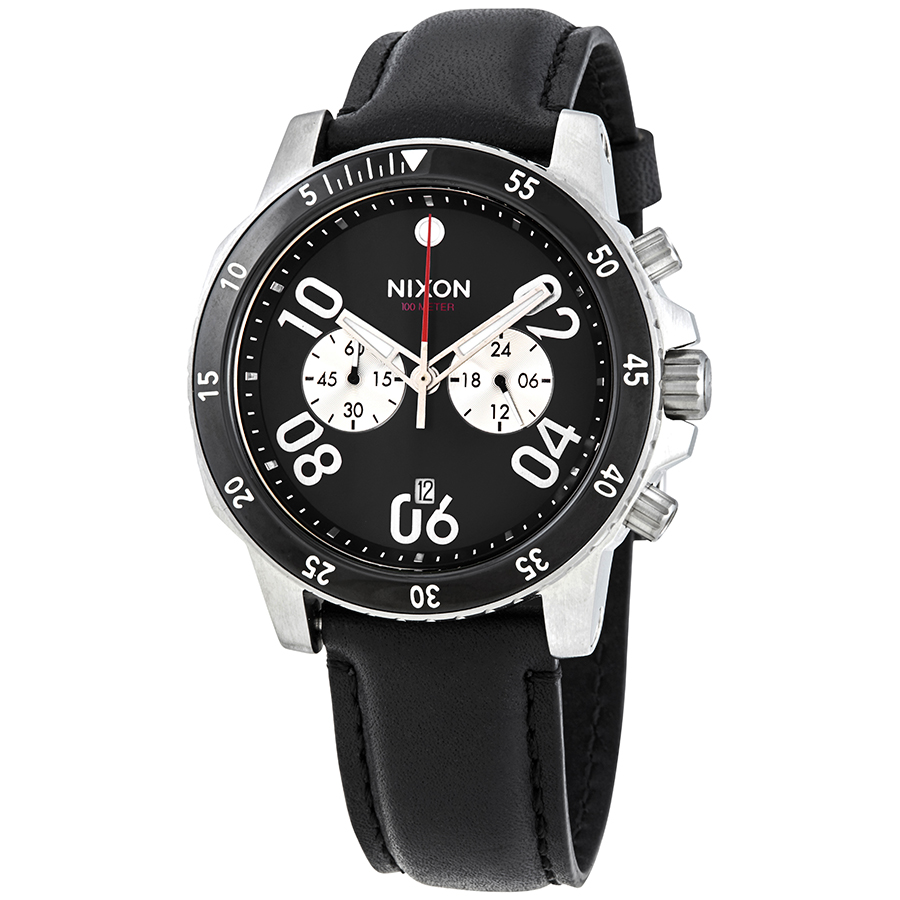 Stainless steel case with a black leather strap. Uni-directional rotating stainless steel bezel with a black ring. Black dial with luminous silver-tone hands and alternating Arabic numeral and index hour markers. Minute markers around the outer rim. Dial Type: Analog. Date display at the 6 o'clock position. Chronograph - two white sub-dials displaying: 60 second and 24 hour. Quartz movement. Scratch resistant mineral crystal. Solid case back. Round case shape. Case size: 44 mm. Case thickness: 12 mm. Band width: 22 mm. Tang clasp. Water resistant at 100 meters / 330 feet. Functions: chronograph, hour, minute, second. Sport watch style. Watch label: Japan Movt. Nixon Ranger Chronograph Quartz Black Dial Watch A940000-00.