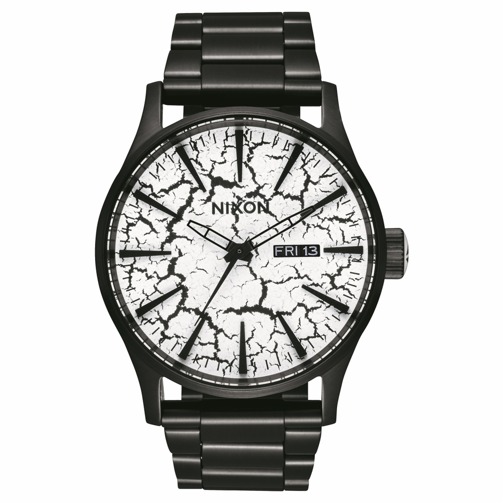 Black stainless steel case and bracelet. Fixed black-plated bezel. Crackle dial with black hands and index hour markers. Minute markers around the outer rim. Dial Type: Analog. Day of the week and date display at the 3 o'clock position. Quartz movement. Scratch resistant mineral crystal. Pull / push crown. Solid case back. Round case shape. Case size: 42 mm. Case thickness: 11 mm. Bracelet width: 23 mm. Fold over clasp with a safety release. Water resistant at 100 meters / 330 feet. Functions: date, day, hour, minute, second. Sentry Series. Luxury watch style. Watch label: Japan Movt. Nixon Sentry Quartz Mens Watch A356-2613-00.
