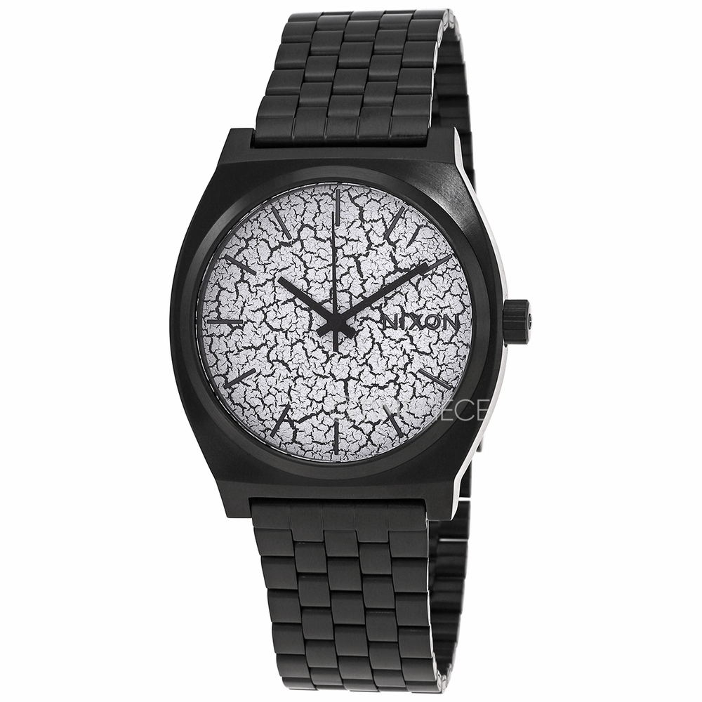 Black-plated stainless steel case with a black-plated metal bracelet. Fixed black-plated bezel. White (black crackle) dial with black hands and index hour markers. Dial Type: Analog. Quartz movement. Scratch resistant mineral crystal. Pull / push crown. Solid case back. Tonneau case shape. Case size: 37 mm. Case thickness: 9 mm. Band width: 20 mm. Fold over clasp. Water resistant at 100 meters / 330 feet. Functions: hour, minute, second. Time Teller Series. Casual watch style. Nixon Time Teller Quartz White Crackle Dial Mens Watch A045-2613-00.