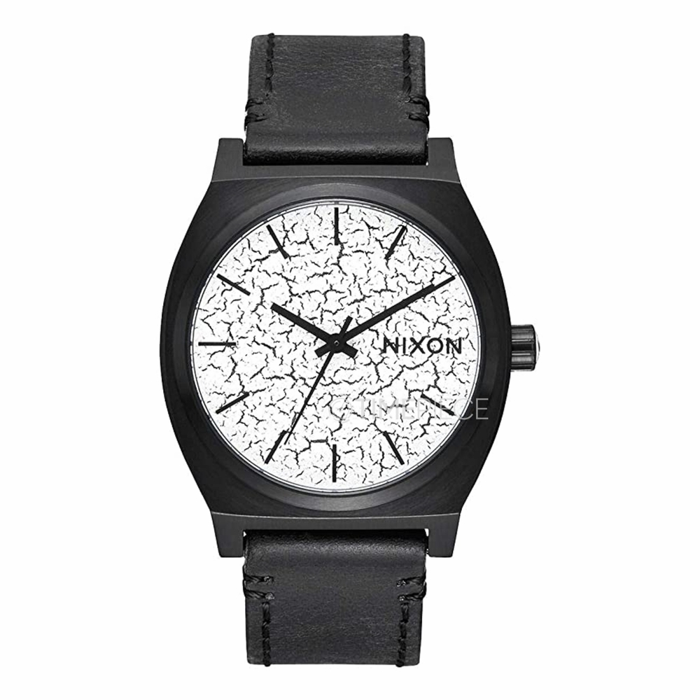 Black-plated stainless steel case with a black leather strap. Fixed black-plated bezel. White (black crackle) dial with black hands and index hour markers. Dial Type: Analog. Quartz movement. Scratch resistant mineral crystal. Pull / push crown. Solid case back. Round case shape. Case size: 37 mm. Case thickness: 9 mm. Band width: 20 mm. Tang clasp. Water resistant at 100 meters / 330 feet. Functions: hour, minute, second. Time Teller Series. Casual watch style. Watch label: Japan Movt. Nixon Time Teller Quartz White CrackleDial Mens Watch A045-2614-00.