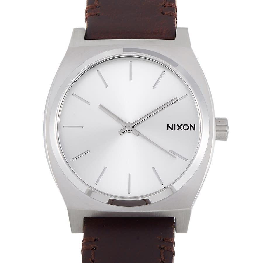Silver-tone stainless steel case with a brown leather strap. Fixed silver-tone stainless steel bezel. Silver-tone dial with silver-tone hands and index hour markers. Dial Type: Analog. Quartz movement. Solid case back. Round case shape, case size: 37 mm. Buckle clasp. Water resistant at 100 meters / 330 feet. Functions: hour, minute, second. Time Teller Series. Dress watch style. Nixon Time Teller Quartz Silver Dial Ladies Watch A1137-2872-00.