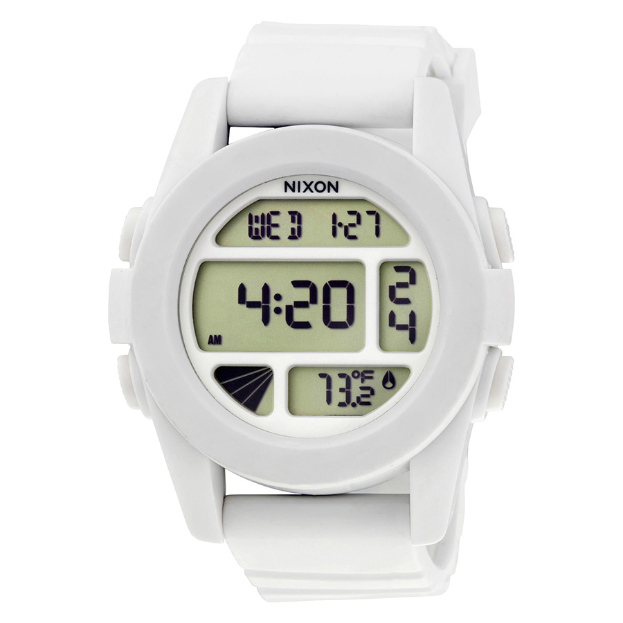 White polycarbonate case with a white rubber strap. Fixed white polycarbonate bezel. Digital dial. Hours, minutes, seconds, am/pm, date, day of the week and temperature. Dial Type: digital. Perpetual calendar. Quartz movement. Scratch resistant mineral crystal. Solid case back. Case diameter: 48 mm. Case thickness: 11 mm. Round case shape. Band width: 22 mm. Band length: 9 inches. Tang clasp. Water resistant at 100 meters/ 330 feet. Functions: hours, minutes, seconds, date, chronograph, countdown timer, thermometer. Sport watch style. Nixon Unit Series White Mens Watch A197100.