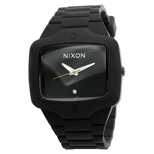Black silicone and stainless steel case with a black polycarbonate bracelet. Fixed black silicone bezel. Black dial with silver-tone hands. A single diamond at the 6 o'clock position. the nixon name appears at the 12 o'clock position. Dial Type: Analog. Japanese quartz movement. Scratch resistant mineral crystal. Three gasket crown. Solid case back. Case diameter: 45 mm. Case thickness: 15 mm. Rectangle case shape. Butterfly clasp. Water resistant at 100 meters / 330 feet. Functions: hour, minute, second. Sport watch style. Nixon Rubber Player Black Dial Polycarbonate Strap Mens Watch A139000.