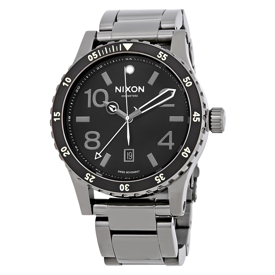 Gunmetal-plated stainless steel case and bracelet. Uni-directional rotating gunmetal-plated bezel with a black top ring. Black dial with luminous silver-tone hands and alternating index and Arabic numeral hour markers. Minute markers around the outer rim. Dial Type: Analog. Luminescent hands and markers. Date display at the 6 o'clock position. Quartz movement. Scratch resistant mineral crystal. Screw down crown. Solid case back. Round case shape. Case size: 45 mm. Case thickness: 13 mm. Band width: 23 mm. Band length: 8.5 inches. Fold over clasp. Water resistant at 200 meters / 660 feet. Functions: date, hour, minute, second. Sport watch style. Nixon Diplomat SS Black Dial Mens Gunmetal Steel Watch A2771885.