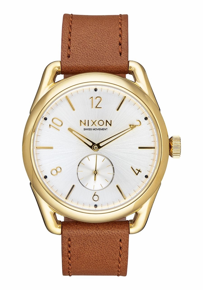 Yellow gold-tone stainless steel case with a brown leather strap. Fixed yellow gold-tone bezel. White dial with luminous gold-tone hands and alternating Arabic numeral and index hour markers. Minute markers around the outer rim. Dial Type: Analog. Luminescent hands. Small seconds sub-dial. Quartz movement. Scratch resistant mineral crystal. Pull / push crown. Solid case back. Round case shape. Case size: 39 mm. Case thickness: 11 mm. Band width: 18 mm. Tang clasp. Water resistant at 100 meters / 330 feet. Functions: hour, minute, small second. C39 Leather Series. Casual watch style. Watch label: Japan Movt. Nixon C39 Leather White Dial Mens Watch A4592227.