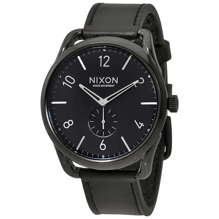 Black IP stainless steel case with a black leather strap. Fixed black stainless steel bezel. Black dial with silver-tone hands and index and Arabic numeral hour markers. Minute markers around the outer rim. Dial Type: Analog. Small seconds sub-dials subdials. Quartz movement. Scratch resistant mineral crystal. Pull / push crown. Case size: 45 mm. Round case shape. Water resistant at 100 meters / 330 feet. Functions: hour, minute, second. Casual watch style. Nixon C45 Black Leather Mens Watch A465000.