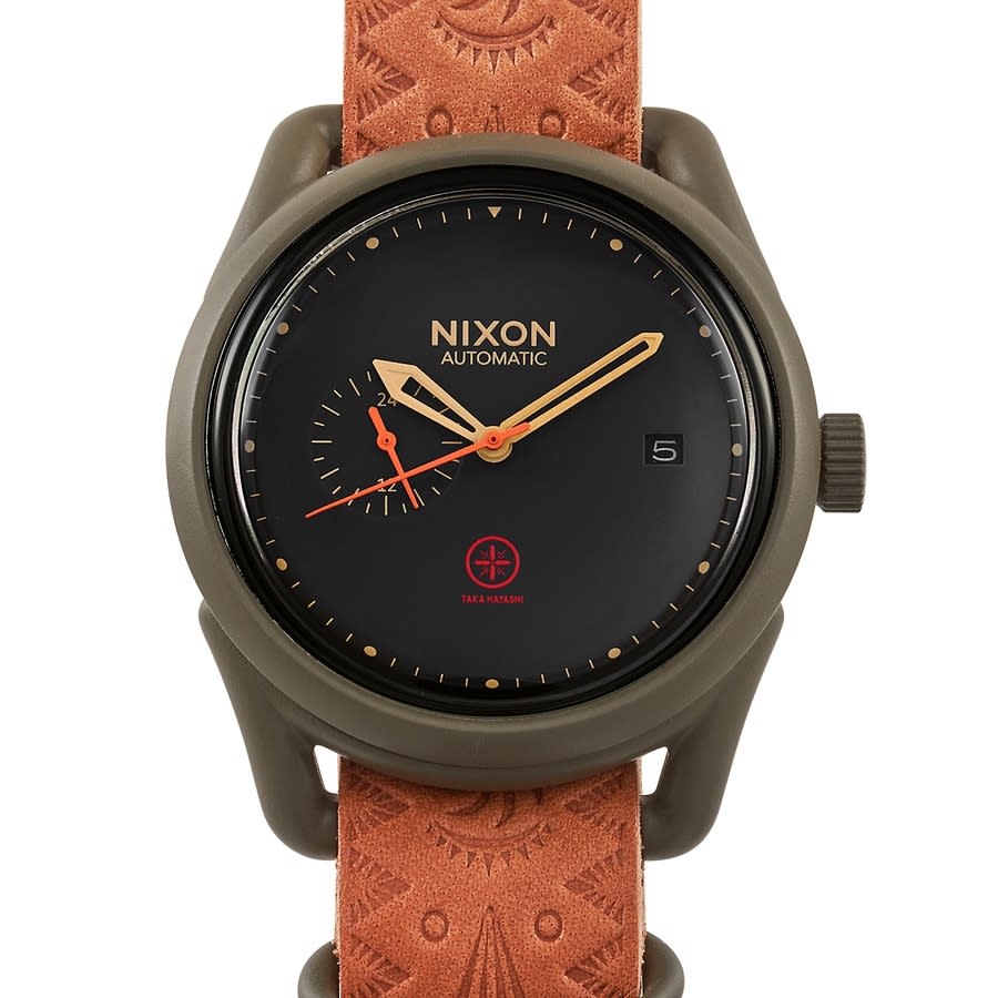 Brown stainless steel case with a leather strap. Brown bezel. Black dial with rose gold-tone hands and index hour markers. Minute markers around the outer rim. Dial Type: Analog. Date display at the 3 o'clock position. Automatic movement. Scratch resistant mineral crystal. Solid case back. Round case shape, case size: 39 mm. Buckle clasp. Water resistant at 50 meters / 165 feet. Functions: date, hour, minute, second. X Taka Hayashi Series. Luxury watch style. Watch label: Japan Movt. Nixon X Taka Hayashi Automatic Black Dial Ladies Watch A1115-2520-00.