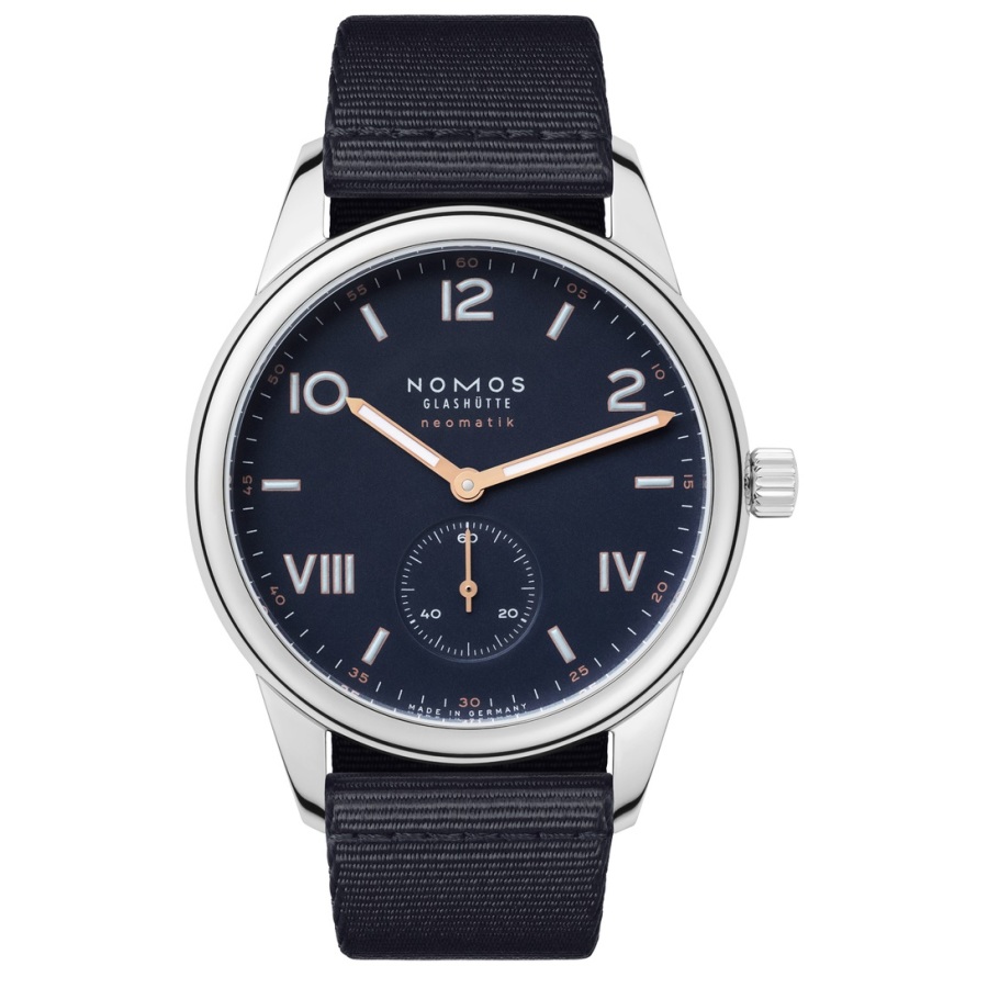 Stainless steel case with a blue nylon strap. Fixed stainless steel bezel. Blue dial with luminous rose gold-tone hands and index hour markers. Arabic numerals appear at the 2, 10 and 12 o'clock positions. Roman numerals appear at the 4 and 8 o'clock positions. Minute markers around the outer rim. Dial Type: Analog. Luminescent hands and markers. Small seconds sub-dial. Nomos calibre DUW 3001 automatic movement, containing 27 Jewels, bitting at 21600 vph, and has a power reserve of approximately 42 hours. Scratch resistant sapphire crystal. Pull / push crown. Transparent case back. Round case shape. Case size: 39.5 mm. Case thickness: 8.4 mm. Band width: 20 mm. Tang clasp. Water resistant at 200 meters / 660 feet. Functions: hour, minute, small second. Additional Info: hour, minute, second. Club Campus Series. Dress watch style. Watch label: Made in Germany. Nomos Club Campus Automatic Blue Dial Mens Watch 768.