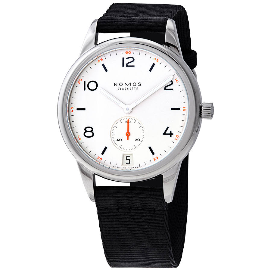 Silver-tone stainless steel case with a blue-black textile strap. Fixed silver-tone stainless steel bezel. Galvanized white dial with rhodium-plated hands and index- Arabic numerals hour markers. Minute markers around the outer rim. Dial Type: Analog. Luminescent hands and markers. Date display at the 6 o'clock position. One- small seconds subdials. Nomos Calibre DUW 5101 automatic movement with a 42-hour power reserve. Scratch resistant sapphire crystal. Screw down crown. Transparent case back. Round case shape, case size: 41.5 mm, case thickness: 9.8 mm. Band width: 20 mm. Buckle clasp. Water resistant at 200 meters / 660 feet. Functions: date, hour, minute, second. Luxury watch style. Watch label: Made in Germany. Nomos Club Galvanized White Dial Automatic Mens Watch 775.