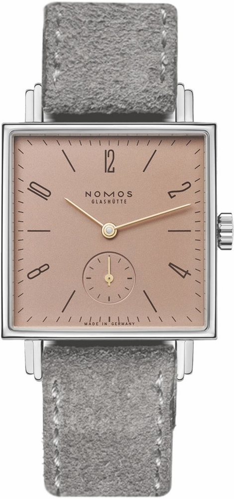 Stainless steel bipartite case with a grey (velour) leather strap. Fixed stainless steel bezel. Copper dial with gold-tone hands and Arabic numeral and index hour markers. Minute markers around the outer rim. Dial Type: Analog. Small seconds sub-dial. Nomos calibre Alpha Hand Wind movement, containing 17 Jewels, bitting at 21600 vph, and has a power reserve of approximately 43 hours. Scratch resistant sapphire crystal. Pull / push crown. Solid case back. Square case shape. Case dimensionssize: 29.5 mm x 29.5 mm. Case thickness: 6.3 mm. Band width: 18 mm. Tang clasp. Water resistant at 30 meters / 100 feet. Functions: hour, minute, second. Tetra Divine Spark Series. Casual watch style. Watch label: Made in Germany. Nomos Tetra Divine Spark Hand Wind Ladies Watch 443.
