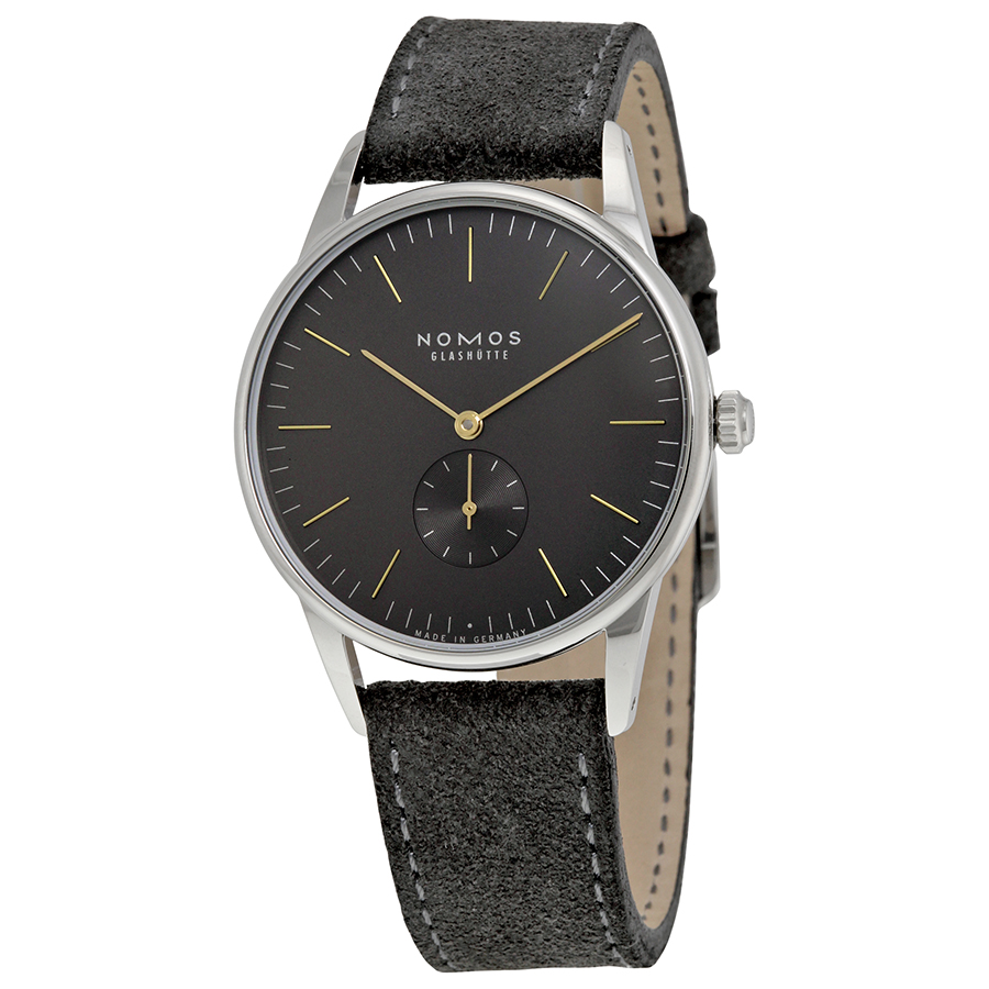 Stainless steel case with a anthracite velour leather strap. Fixed stainless steel bezel. Galvanized, anthracite dial with gold-tone hands and index hour markers. Minute markers around the outer rim. Dial Type: Analog. Small seconds sub-dial. Hand-wind movement with a 43-hour power reserve. Scratch resistant sapphire crystal. Transparent case back. Case size: 38 mm. Case thickness: 8.86 mm. Round case shape. Band width: 19 mm. Tang clasp. Water resistant at 30 meters / 100 feet. Functions: hour, minute, second. Casual watch style. Watch label: Made in Germany. Nomos Orion 1989 Anthracite Dial Velour Leather Strap Mens Watch 385.