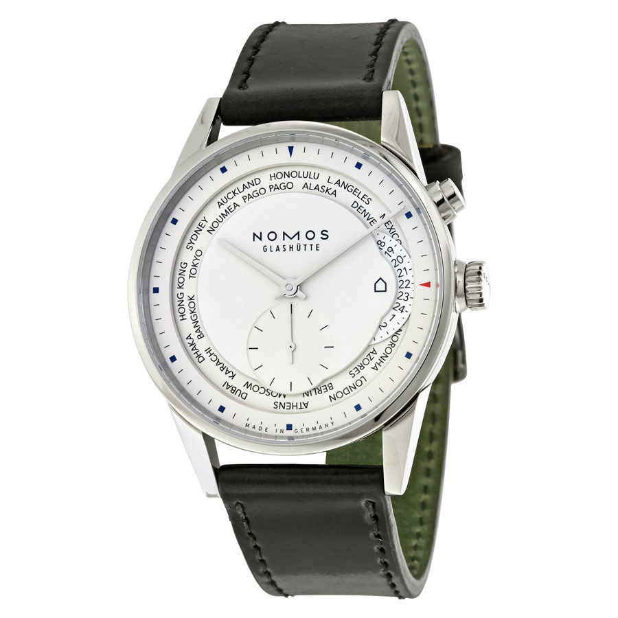 Silver-tone stainless steel case with a black leather strap. Fixed silver-tone stainless steel bezel. Galvanized white slver-plated dial with silver-tone hands and index hour markers. World time cities around an inner ring. minute markers around the outer rim. Dial Type: Analog. Small seconds sub-dial. 24 hour rotating disk at the 3 o'clock position subdials. Nomos Calibre DUW 5201 automatic movement with a 42-hour power reserve. Scratch resistant sapphire crystal. Pull / push crown. Transparent case back. Round case shape, case size: 39.9 mm, case thickness: 10.85 mm. Tang clasp. Water resistant at 30 meters / 100 feet. Functions: date, hour, minute, second, world time. Additional Info: leather strap is made of shell cordovan. Casual watch style. Watch label: Made in Germany. Nomos Zurich Weltzeit Black Leather Mens Watch 805.