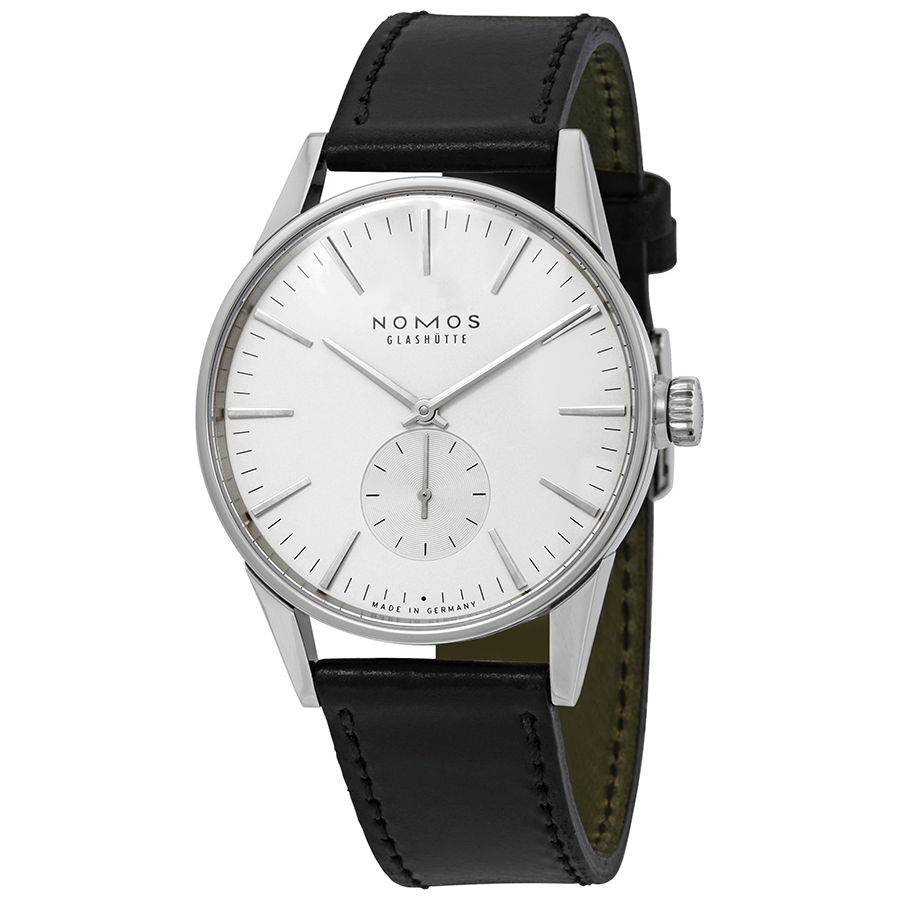 Silver-tone stainless steel case with a black horween genuine shell leather strap. Fixed silver-tone stainless steel bezel. White dial with silver-tone hands and index hour markers. Minute markers around the outer rim. Dial Type: Analog. Nomos Calibre Epsilon Automatic movement, containing 26 Jewels, bitting at 21600 vph, and has a power reserve of approximately 43 hours. Scratch resistant sapphire crystal. Pull / push crown. Solid case back. Round case shape, case size: 39.8 mm, case thickness: 9.6 mm. Band width: 20 mm. Buckle clasp. Water resistant at 30 meters / 100 feet. Functions: hour, minute, small second. Zurich Series. Luxury watch style. Watch label: Made in Germany. Nomos Zurich Automatic White Dial Mens Watch 806.