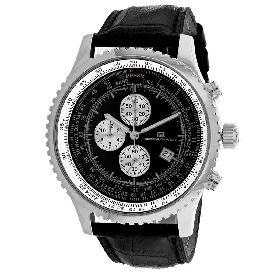 Silver-tone stainless steel case with a black leather strap. Fixed silver-tone stainless steel bezel. Black dial with silver-tone hands and index hour markers. Minute markers around the outer rim. Dial Type: Analog. Luminescent hands. Date display at the 4 o'clock position. Chronograph - three sub-dials displaying: 60 second, 60 minute and 12 hour. Quartz movement. Scratch resistant mineral crystal. Round case shape, case size: 48 mm. Band width: 24 mm. Buckle clasp. Water resistant at 50 meters / 165 feet. Functions: chronograph, date, hour, minute, second. Actuator Series. Fashion watch style. Oceanaut Actuator Chronograph Quartz Black Dial Mens Watch OC0311.