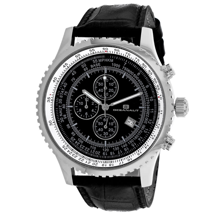 Silver-tone stainless steel case with a black leather strap. Fixed silver-tone stainless steel bezel. Black dial with silver-tone hands and index hour markers. Minute markers around the outer rim. Dial Type: Analog. Luminescent hands and markers. Date display at the 4 o'clock position. Chronograph - three sub-dials displaying: 60 second, 60 minute and 12 hour. Quartz movement. Scratch resistant mineral crystal. Round case shape, case size: 48 mm. Band width: 24 mm. Buckle clasp. Water resistant at 50 meters / 165 feet. Functions: chronograph, date, hour, minute, second. Actuator Series. Fashion watch style. Oceanaut Actuator Chronograph Quartz Black Dial Mens Watch OC0312.