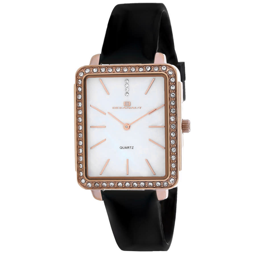 Rose gold-tone stainless steel case with a black rubber strap. Fixed rose gold-tone stainless steel bezel. White dial with rose gold-tone hands and index hour markers. Dial Type: Analog. Quartz movement. Scratch resistant mineral crystal. Square case shape, case size: 44 mm. Band width: 16 mm. Buckle clasp. Water resistant at 30 meters / 100 feet. Functions: hour, minute. Adorn Series. Fashion watch style. Oceanaut Adorn Quartz White Dial Ladies Watch OC0274.