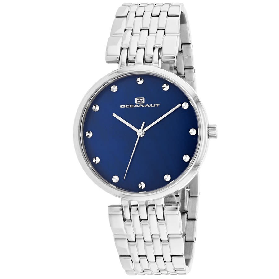 Silver-tone stainless steel case and bracelet. Fixed silver-tone stainless steel bezel. Mother of pearl dial with silver-tone hands and index hour markers. Dial Type: Analog. Quartz movement. Scratch resistant mineral crystal. Round case shape, case size: 36 mm. Band width: 18 mm. Deployment with push button release clasp. Water resistant at 30 meters / 100 feet. Functions: hour, minute, second. Aerglo Series. Fashion watch style. Oceanaut Aerglo Quartz Ladies Watch OC2201.