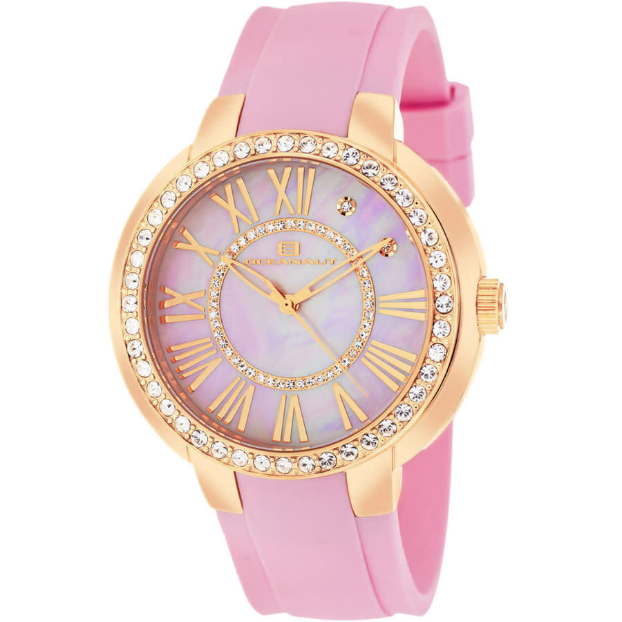 Rose gold-tone stainless steel case with a pink rubber strap. Fixed rose gold-tone stainless steel bezel. Mother of pearl dial with rose gold-tone hands and index hour markers. Dial Type: Analog. Quartz movement. Scratch resistant mineral crystal. Round case shape, case size: 40 mm. Band width: 20 mm. Buckle clasp. Water resistant at 50 meters / 165 feet. Functions: hour, minute, second. Allure Series. Fashion watch style. Oceanaut Allure Quartz Ladies Watch OC6416.
