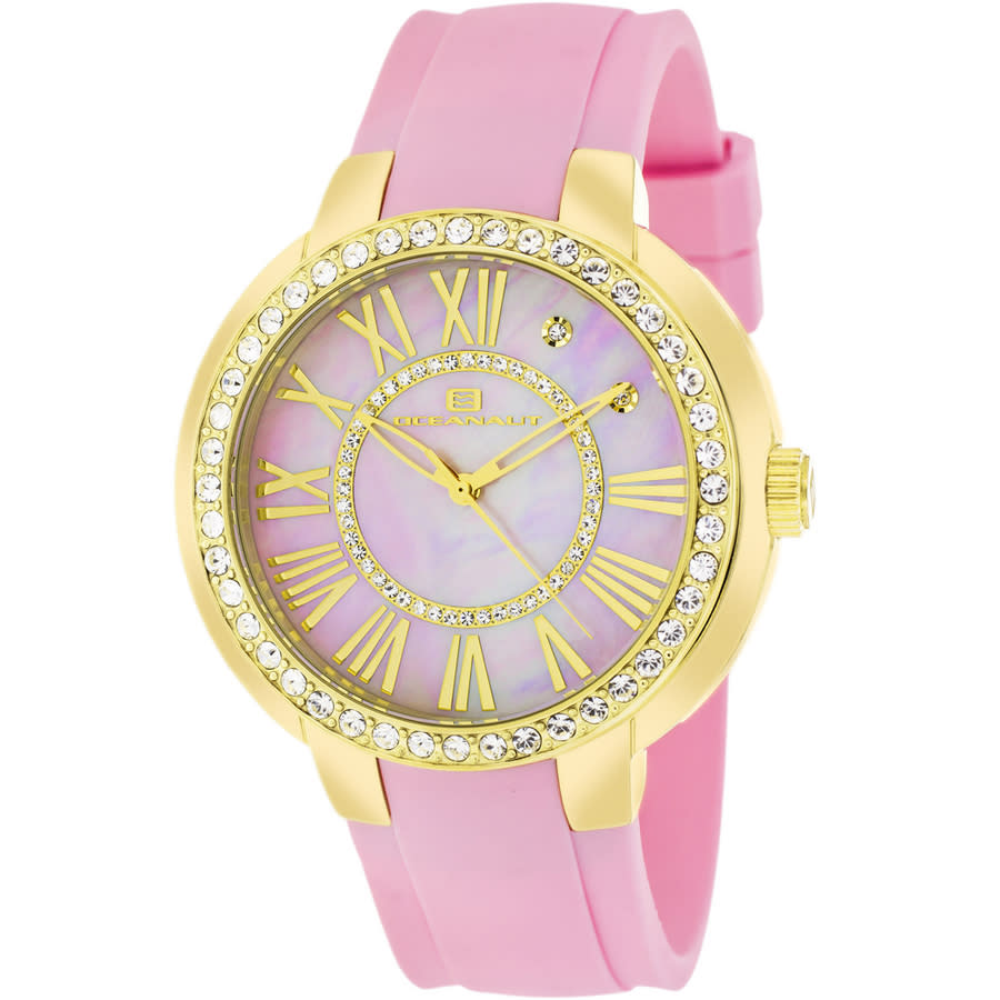 Yellow gold-tone stainless steel case with a pink rubber strap. Fixed yellow gold-tone stainless steel bezel. Mother of pearl dial with yellow gold-tone hands and index hour markers. Dial Type: Analog. Quartz movement. Scratch resistant mineral crystal. Round case shape, case size: 40 mm. Band width: 20 mm. Buckle clasp. Water resistant at 50 meters / 165 feet. Functions: hour, minute, second. Allure Series. Fashion watch style. Oceanaut Allure Quartz Ladies Watch OC6418.