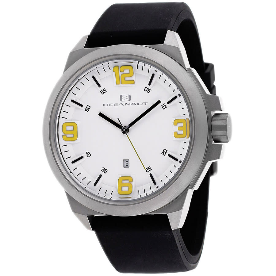 Silver-tone stainless steel case with a black rubber strap. Fixed silver-tone stainless steel bezel. White dial with black hands and index hour markers. Minute markers around the outer rim. Dial Type: Analog. Date display at the 6 o'clock position. Quartz movement. Scratch resistant mineral crystal. Round case shape, case size: 48 mm. Band width: 22 mm. Buckle clasp. Water resistant at 30 meters / 100 feet. Functions: date, hour, minute, second. Armada Series. Fashion watch style. Oceanaut Armada Quartz White Dial Mens Watch OC7118.