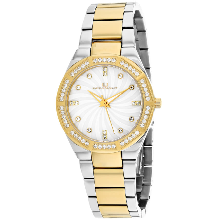 Yellow gold-tone stainless steel case with a two-tone (silver-tone and yellow gold-tone) stainless steel bracelet. Fixed yellow gold-tone stainless steel bezel. Mother of pearl dial with yellow gold-tone hands and index hour markers. Dial Type: Analog. Luminescent hands. Quartz movement. Scratch resistant mineral crystal. Round case shape, case size: 35 mm. Band width: 21 mm. Deployment with push button release clasp. Water resistant at 30 meters / 100 feet. Functions: hour, minute, second. Athena Series. Fashion watch style. Oceanaut Athena Quartz Ladies Watch OC0253.