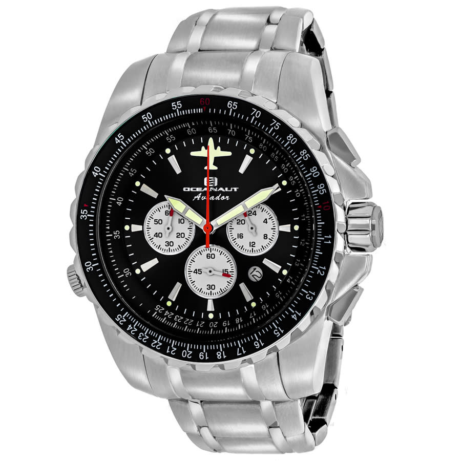 Silver-tone stainless steel case and bracelet. Fixed black stainless steel bezel. Black dial with silver-tone hands and index hour markers. Minute markers around the outer rim. Dial Type: Analog. Luminescent hands and markers. Date display between 4 and 5 o'clock position. Chronograph - three sub-dials displaying: 60 second, 60 minute and 24 hour. Quartz movement. Scratch resistant mineral crystal. Round case shape, case size: 45 mm. Band width: 22 mm. Fold over clasp. Water resistant at 50 meters / 165 feet. Functions: chronograph, date, hour, minute, second. Aviador Pilot Series. Fashion watch style. Oceanaut Aviador Pilot Chronograph Quartz Black Dial Mens Watch OC0112.
