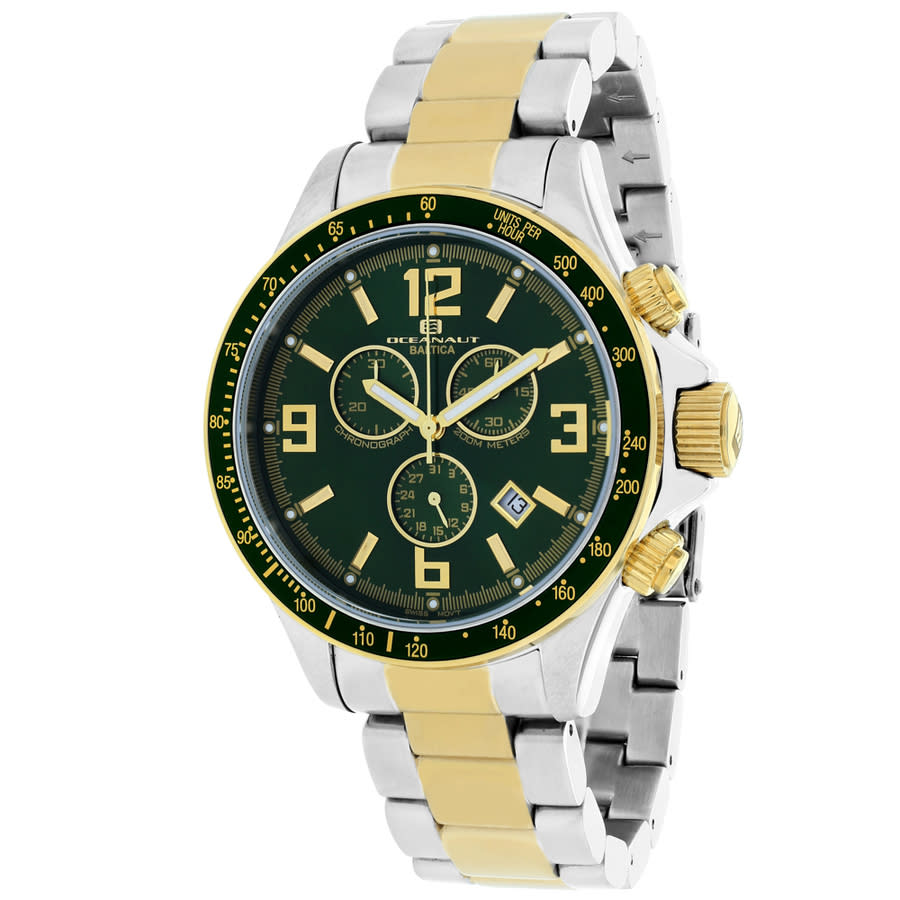 Silver-tone stainless steel case with a two-tone (silver-tone and yellow gold-tone) stainless steel bracelet. Fixed green stainless steel bezel. Green dial with yellow gold-tone hands and index hour markers. Minute markers around the outer rim. Dial Type: Analog. Luminescent hands and markers. Date display between 4 and 5 o'clock position. Quartz movement. Scratch resistant mineral crystal. Round case shape, case size: 42 mm. Band width: 20 mm. Deployment with push button release clasp. Water resistant at 200 meters / 660 feet. Functions: chronograph, date, hour, minute, second. Baltica Series. Fashion watch style. Oceanaut Baltica Chronograph Quartz Green Dial Mens Watch OC3333.